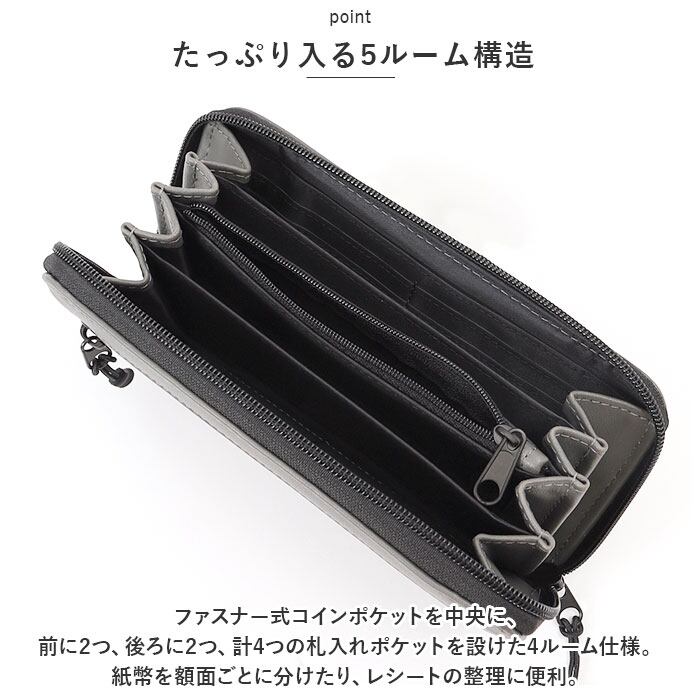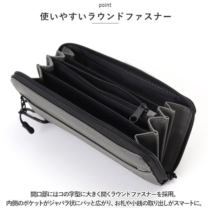 ・開口部にはコの字型に大きく開くラウンドファスナーを採用。内側のポケットがジャバラ状にパッと広がり、お札や小銭の取り出しがスマートに。