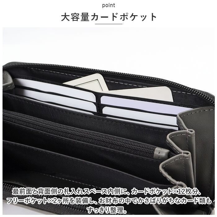 ・最前面と背面側の札入れスペース内側に、カードポケット×12枚分、フリーポケット×2ヶ所を装備し、お財布の中でかさばりがちなカード類もすっきり整理。