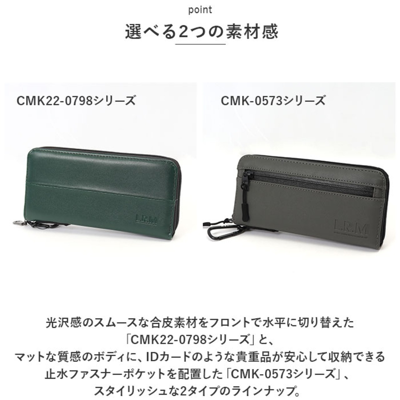 ・光沢感のスムースな合皮素材をフロントで水平に切り替えた「CMK22-0798シリーズ」と、マットな質感のボディに、IDカードのような貴重品が安心して収納できる止水ファスナーポケットを配置した「CMK-0573シリーズ」、スタイリッシュな2タイプのラインナップ。