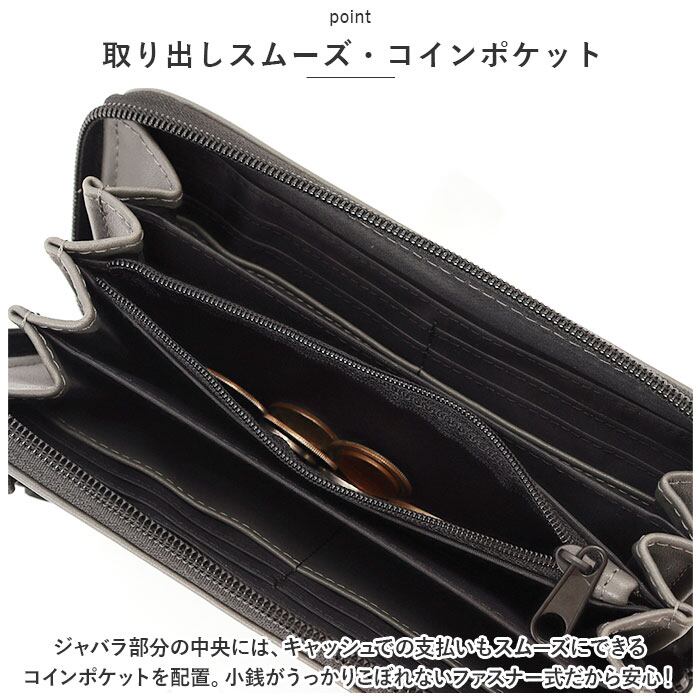 ・ジャバラ部分の中央には、キャッシュでの支払いもスムーズにできるコインポケットを配置。小銭がうっかりこぼれないファスナー式だから安心!