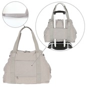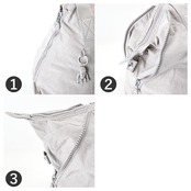・両側にジッパーとスナップボタン付き、上部左右のマチ部分の開閉で容量調節。荷物の量にあわせてバッグの大きさをかえられる。