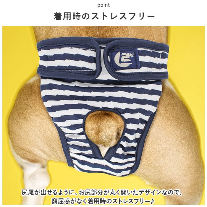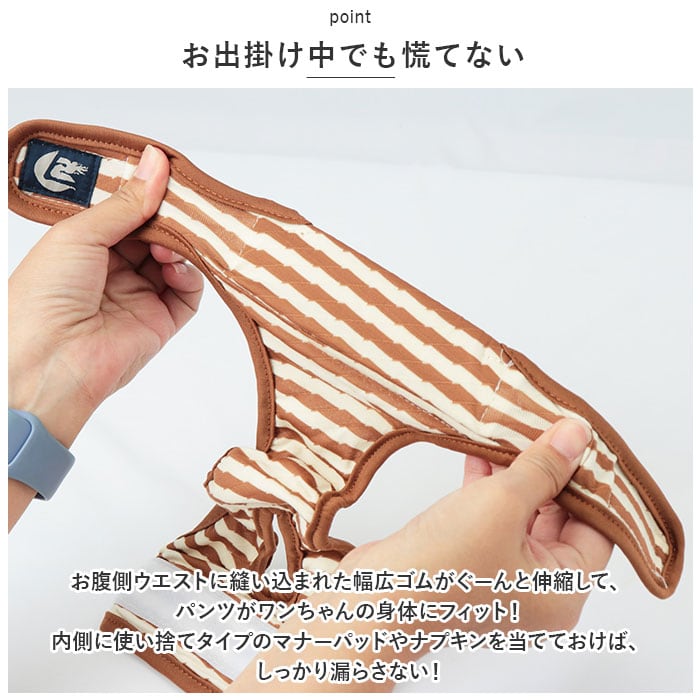 ・お腹側ウエストに縫い込まれた幅広ゴムがぐーんと伸縮して、パンツがワンちゃんの身体にフィット!内側に使い捨てタイプのマナーパッドやナプキンを当てておけば、しっかり漏らさない!