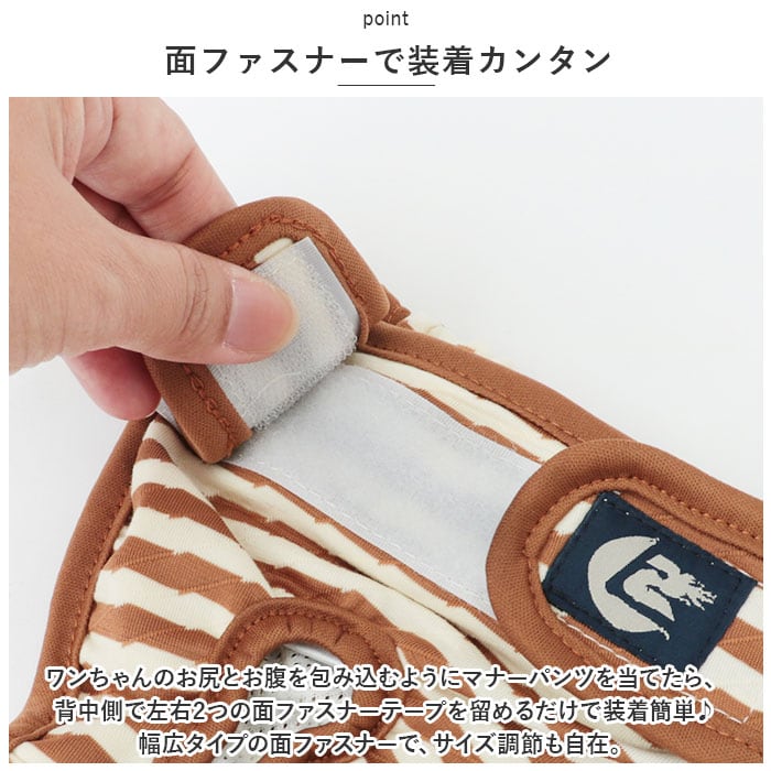・ワンちゃんのお尻とお腹を包み込むようにマナーパンツを当てたら、背中側で左右2つの面ファスナーテープを留めるだけで装着簡単♪幅広タイプの面ファスナーで、サイズ調節も自在。