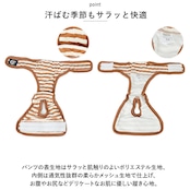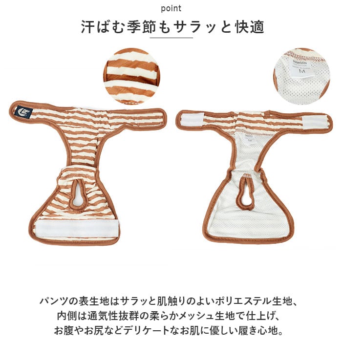 ・パンツの表生地はサラッと肌触りのよいポリエステル生地、内側は通気性抜群の柔らかメッシュ生地で仕上げ、お腹やお尻などデリケートなお肌に優しい履き心地。