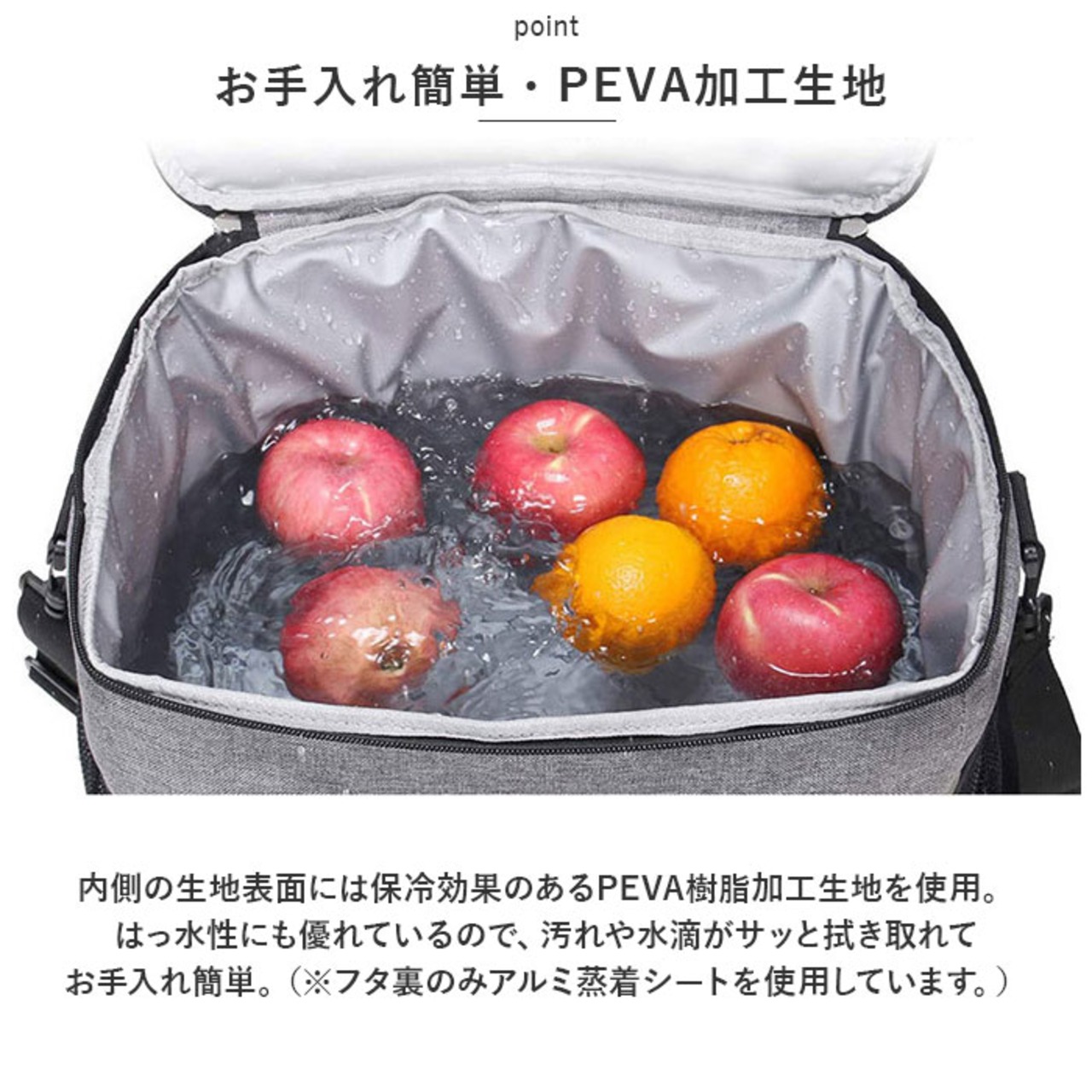 ・内側の生地表面には保冷効果のあるPEVA樹脂加工生地を使用。はっ水性にも優れているので、汚れや水滴がサッと拭き取れてお手入れ簡単。(※フタ裏のみアルミ蒸着シートを使用しています。)