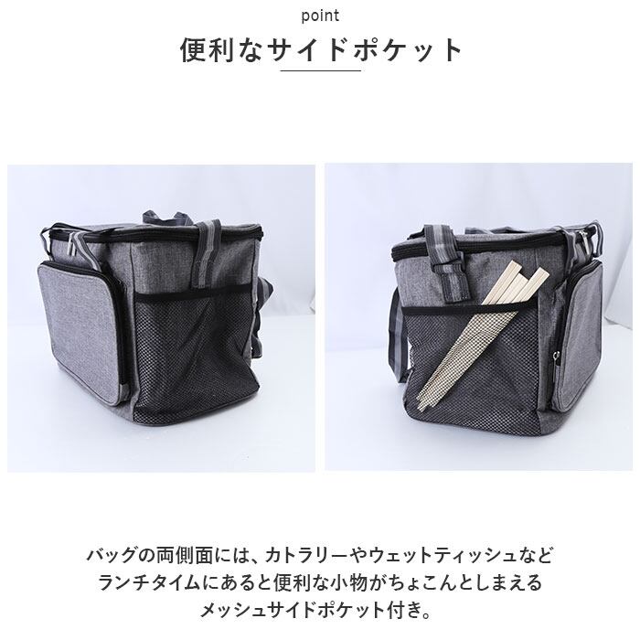 ・バッグの両側面には、カトラリーやウェットティッシュなど、ランチタイムにあると便利な小物がちょこんとしまえるメッシュサイドポケット付き。