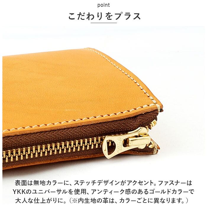 ・表面は無地カラーに、ステッチデザインがアクセント。ファスナーはYKKのユニバーサルを使用、アンティーク感のあるゴールドカラーで大人な仕上がりに。(※内生地の革は、カラーごとに異なります。)