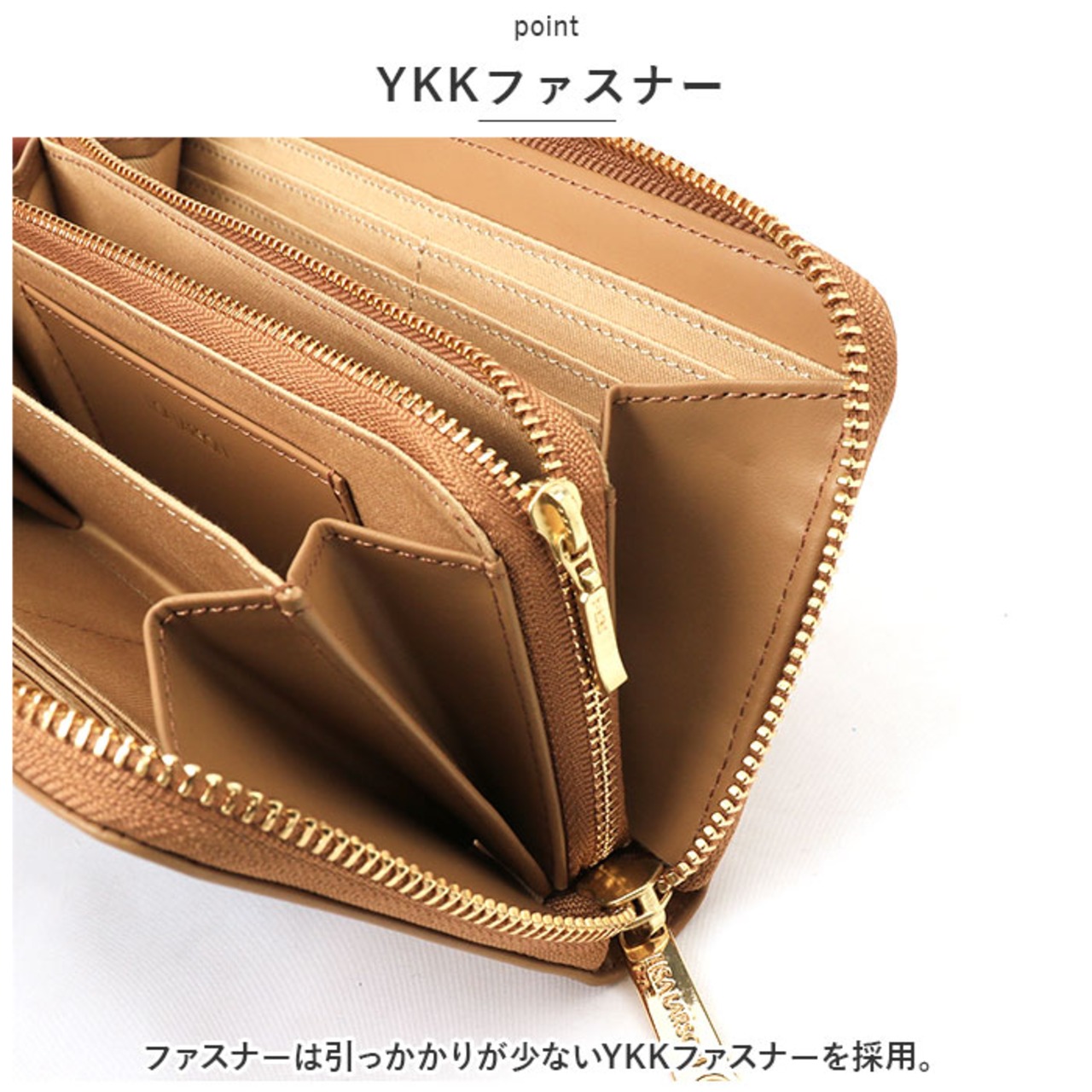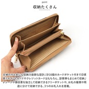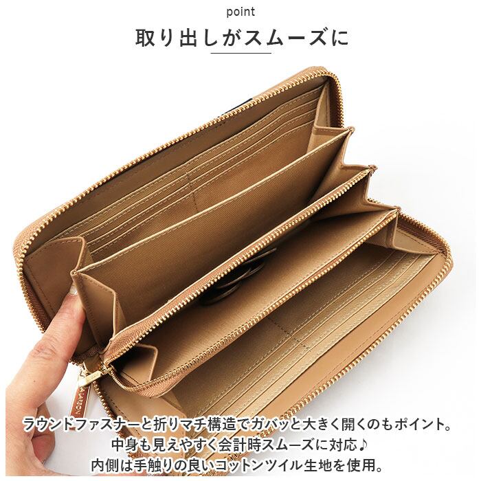 ・ラウンドファスナーと折りマチ構造でガバッと大きく開くのもポイント。中身も見えやすく会計時スムーズに対応♪