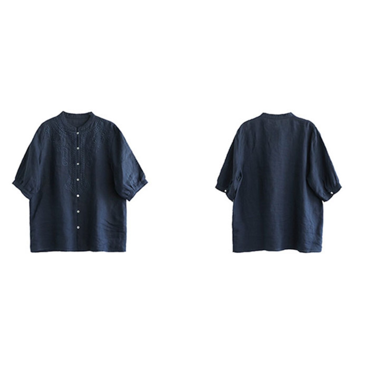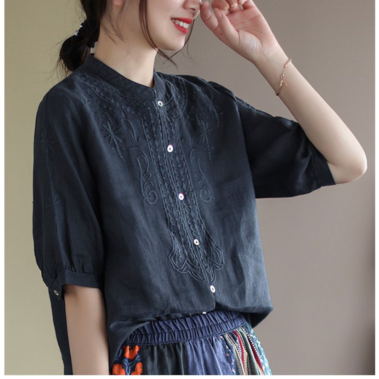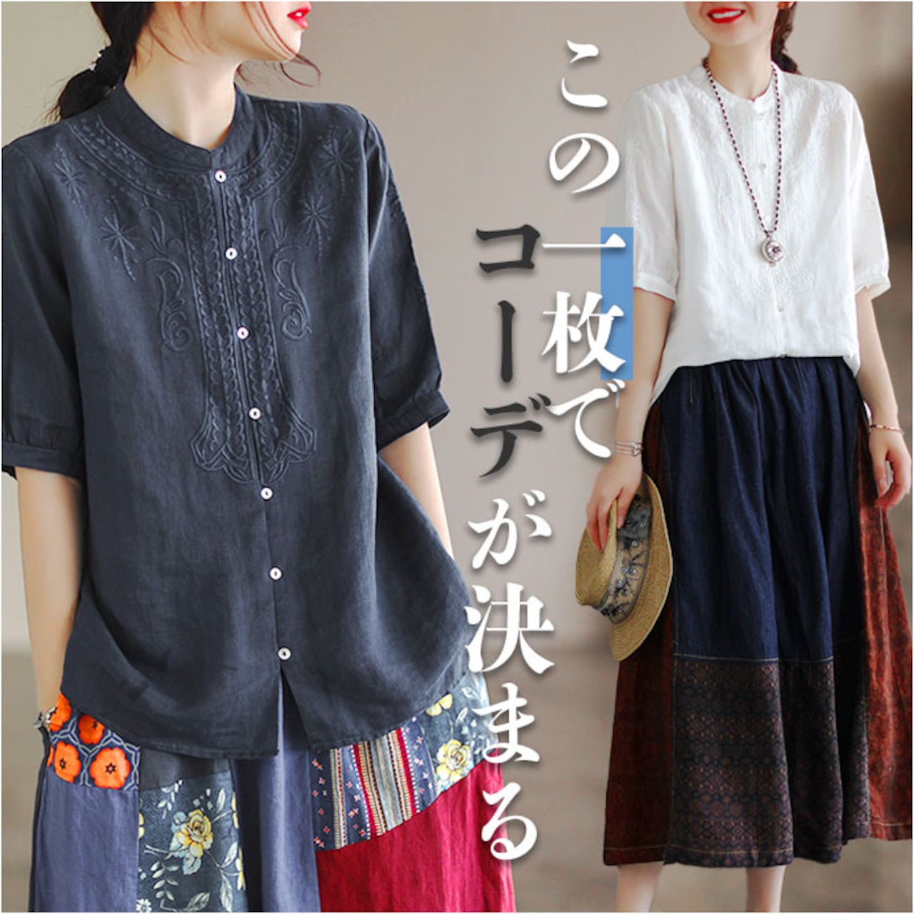 チュニック ブラウス 半袖 通販 半袖シャツ トップス シャツ シャツブラウス リネンシャツ 綿麻 春 夏 刺繍 スタンドカラー ボタン 前開き 通気性 吸湿 通勤 通学 シンプル 無地 上品 おしゃれ 柔らかい アウター