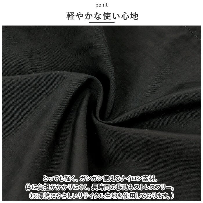 ・とっても軽く、ガシガシ使えるナイロン素材。体に負担がかかりにくく、長時間の移動もストレスフリー。(※環境にやさしいリサイクル生地を使用しております。)