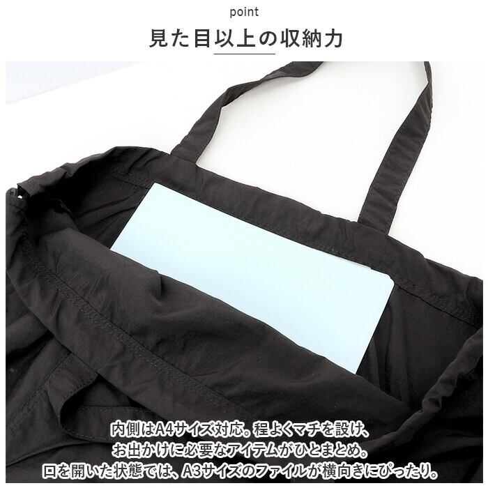 ・内側はA4サイズ対応。程よくマチを設け、お出かけに必要なアイテムがひとまとめ。口を開いた状態では、A3サイズのファイルが横向きにぴったり。