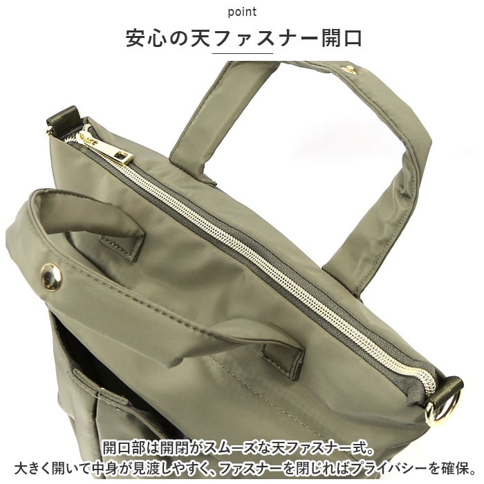 ・開口部は開閉がスムーズな天ファスナー式。大きく開いて中身が見渡しやすく、ファスナーを閉じればプライバシーを確保。