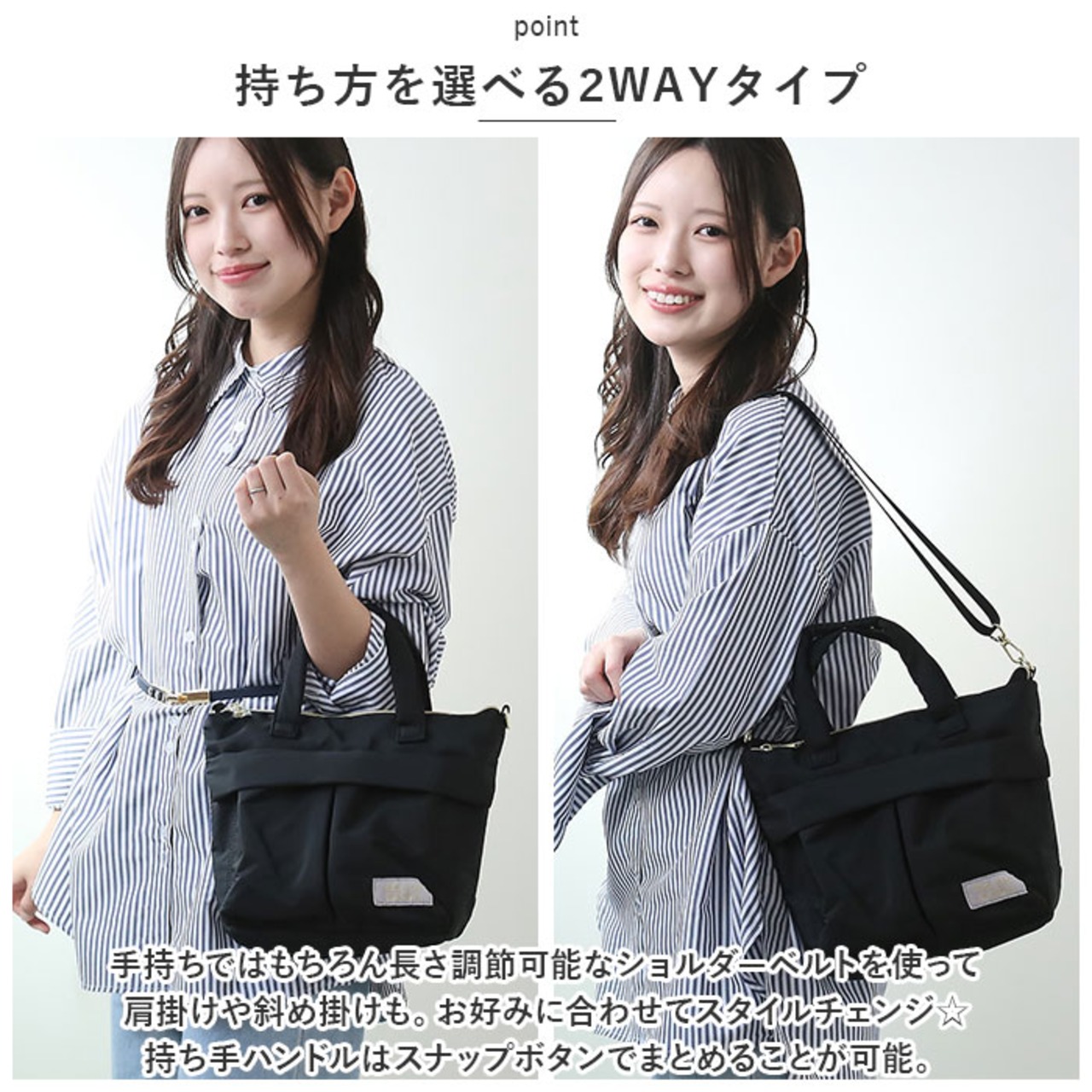 ・手持ちではもちろん!長さ調節可能なショルダーベルトを使って肩掛けや斜め掛けも。お好みに合わせてスタイルチェンジ☆持ち手ハンドルはスナップボタンでまとめることが可能。