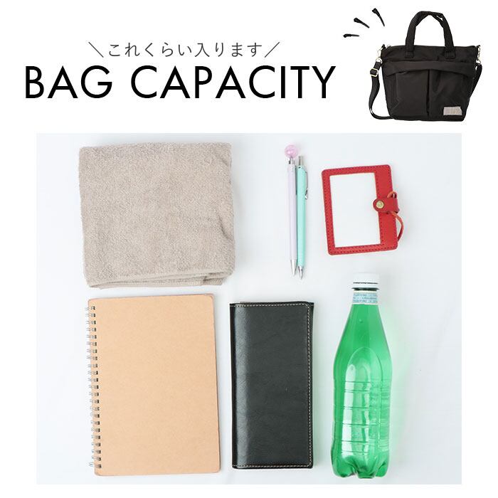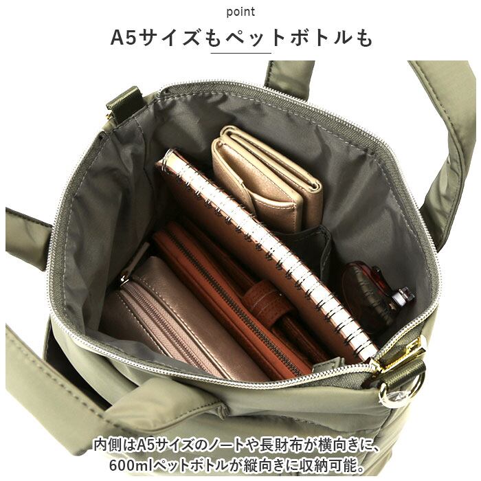 ・内側はA5サイズのノートや長財布が横向きに、600mlペットボトルが縦向きに収納可能。