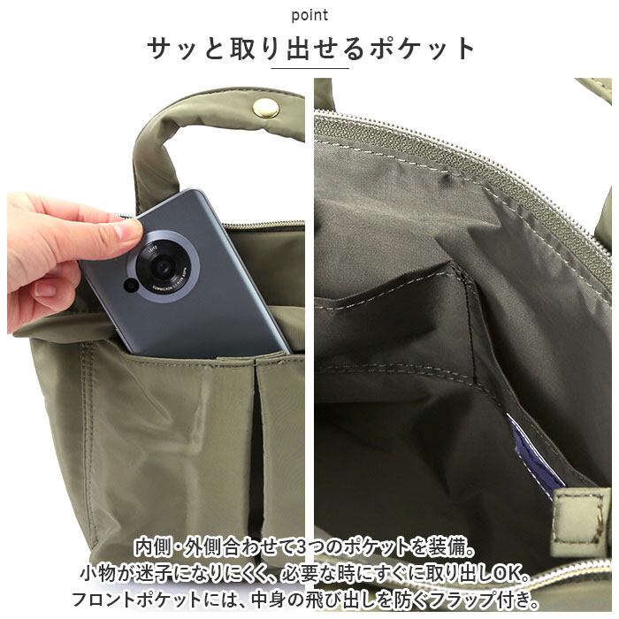 ・内側・外側合わせて3つのポケットを装備。小物が迷子になりにくく、必要な時にすぐに取り出しOK。フロントポケットには、中身の飛び出しを防ぐフラップ付き。