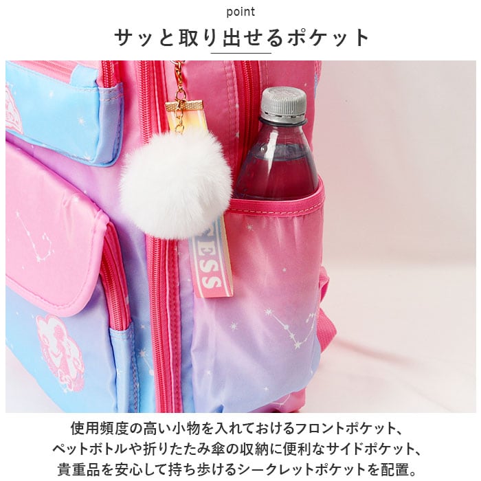 ・使用頻度の高い小物を入れておけるフロントポケット、ペットボトルや折りたたみ傘の収納に便利なサイドポケット、貴重品を安心して持ち歩けるシークレットポケットを配置。