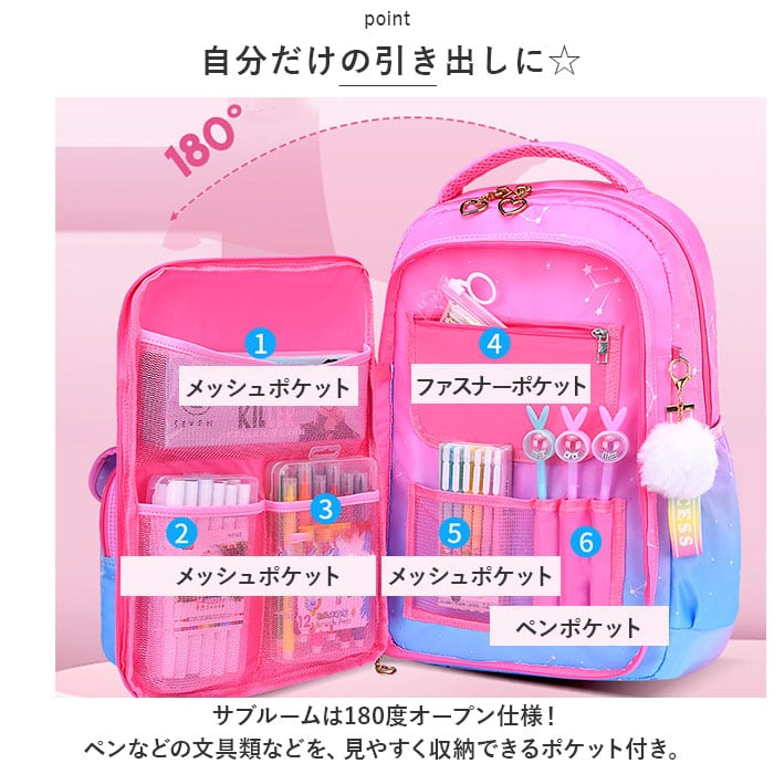 ・サブルームは180度オープン仕様!ペンなどの文具類などを、見やすく収納できるポケット付き。