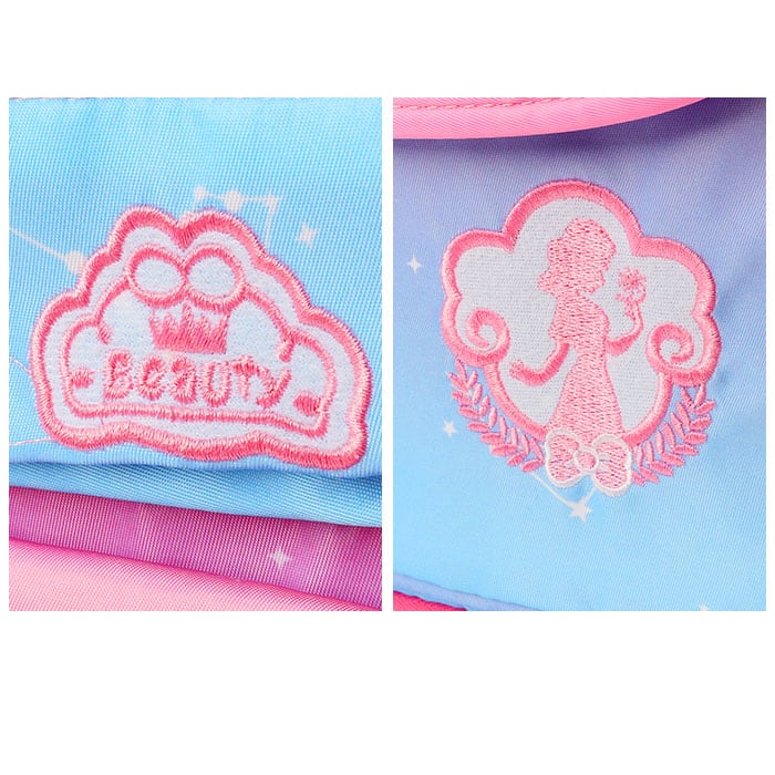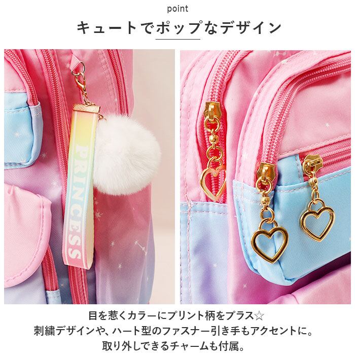 ・目を惹くカラーにプリント柄をプラス☆刺繍デザインや、ハート型のファスナー引き手もアクセントに。取り外しできるチャームも付属。