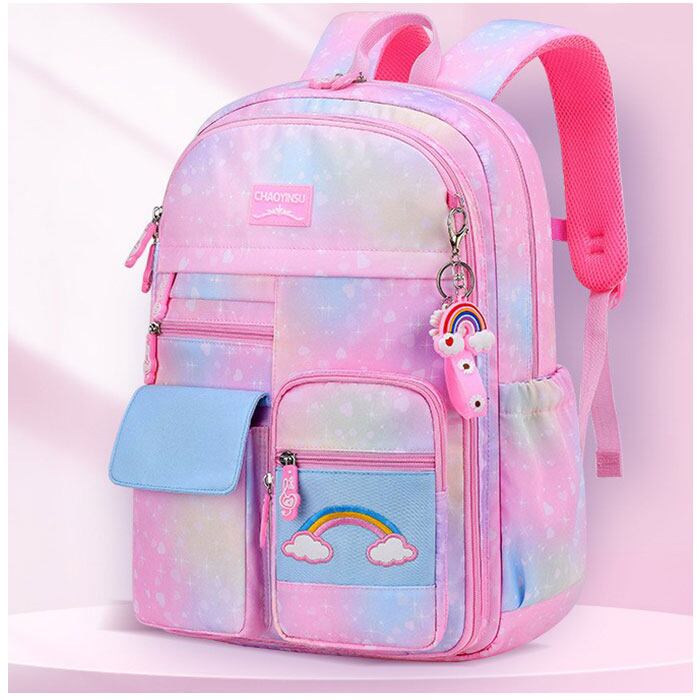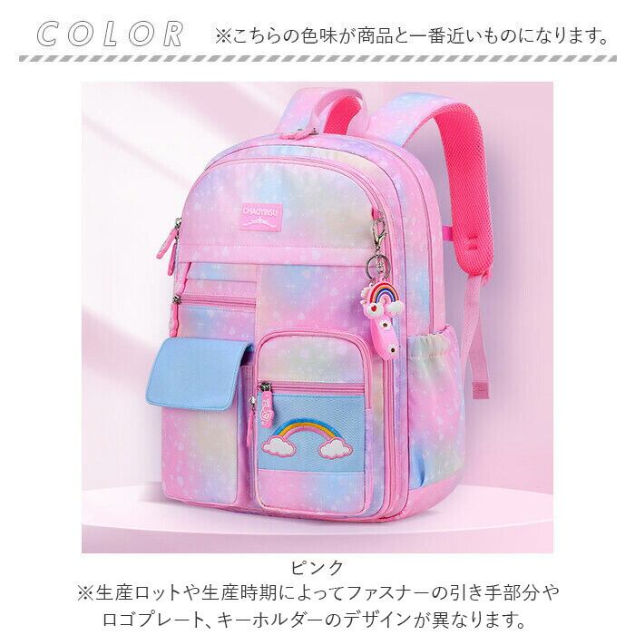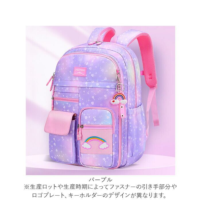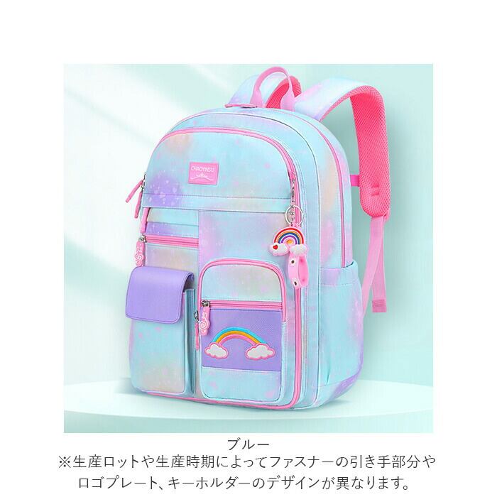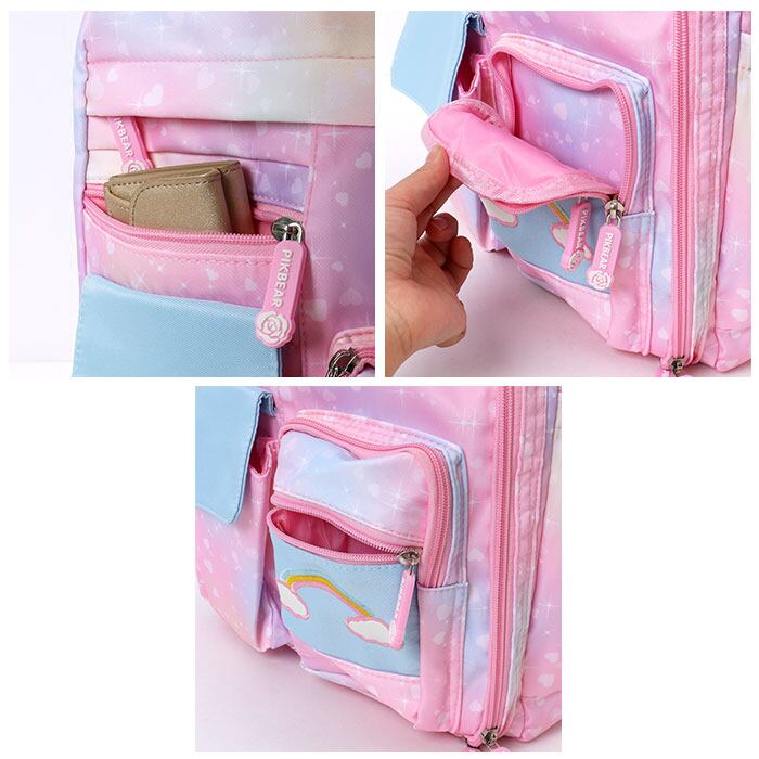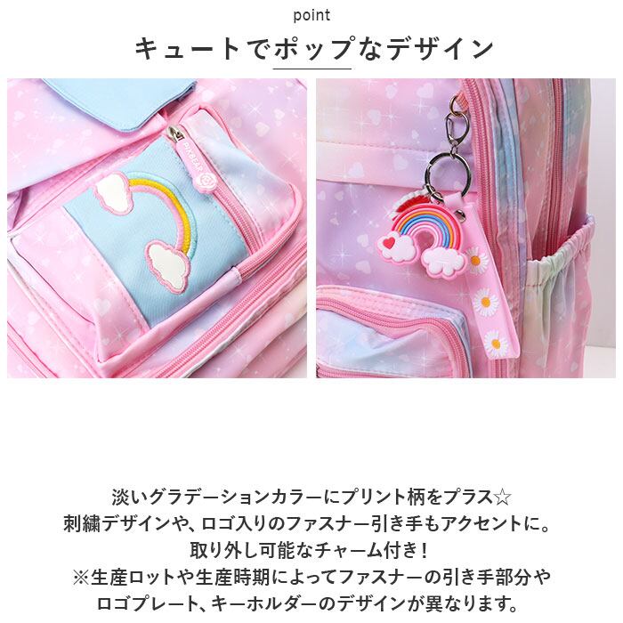 ・淡いグラデーションカラーにプリント柄をプラス☆刺繍デザインや、ロゴ入りのファスナー引き手もアクセントに。取り外し可能なチャーム付き!(※生産ロットや生産時期によってファスナーの引き手部分やロゴプレート、キーホルダーのデザインが異なります。)