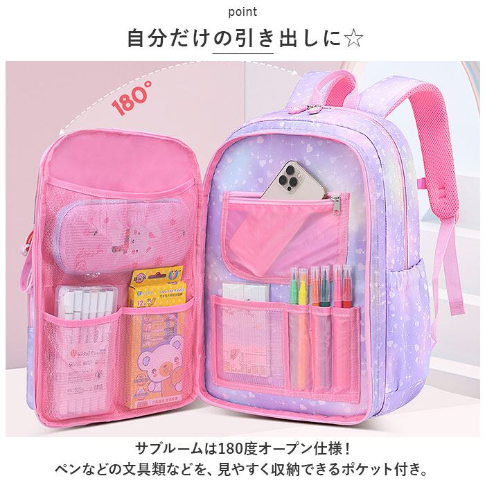 ・サブルームは180度オープン仕様!ペンなどの文具類などを、見やすく収納できるポケット付き。