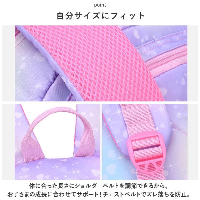 ・体に合った長さにショルダーベルトを調節できるから、お子さまの成長に合わせてサポート!チェストベルトでズレ落ちを防止。