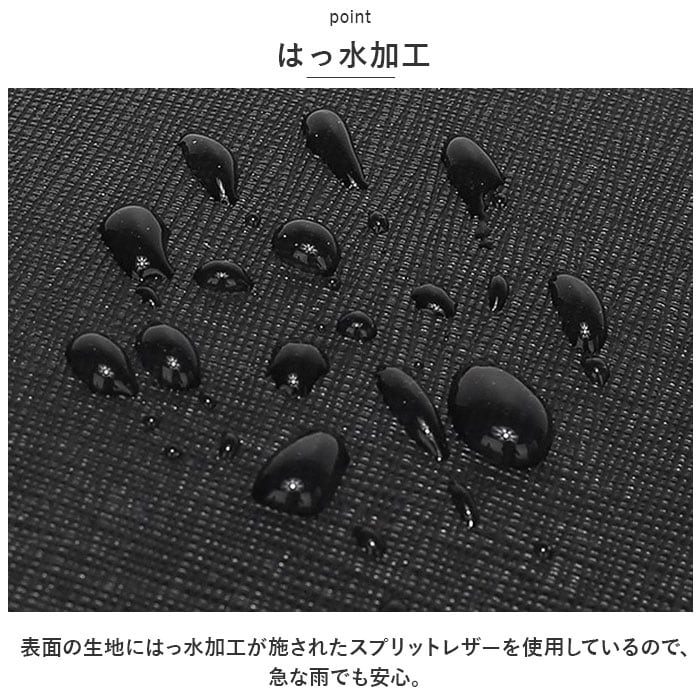 ・表面の生地にはっ水加工が施されたスプリットレザーを使用しているので、急な雨でも安心。