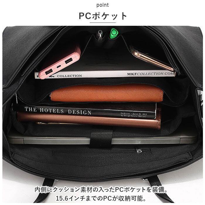 ・内側にクッション素材の入ったPCポケットを装備。15.6インチまでのPCが収納可能。