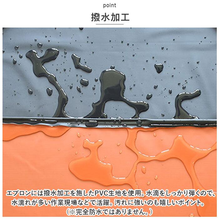 ・エプロンには撥水加工を施したPVC生地を使用。水滴をしっかり弾くので、水濡れが多い作業現場などで活躍。汚れに強いのも嬉しいポイント。