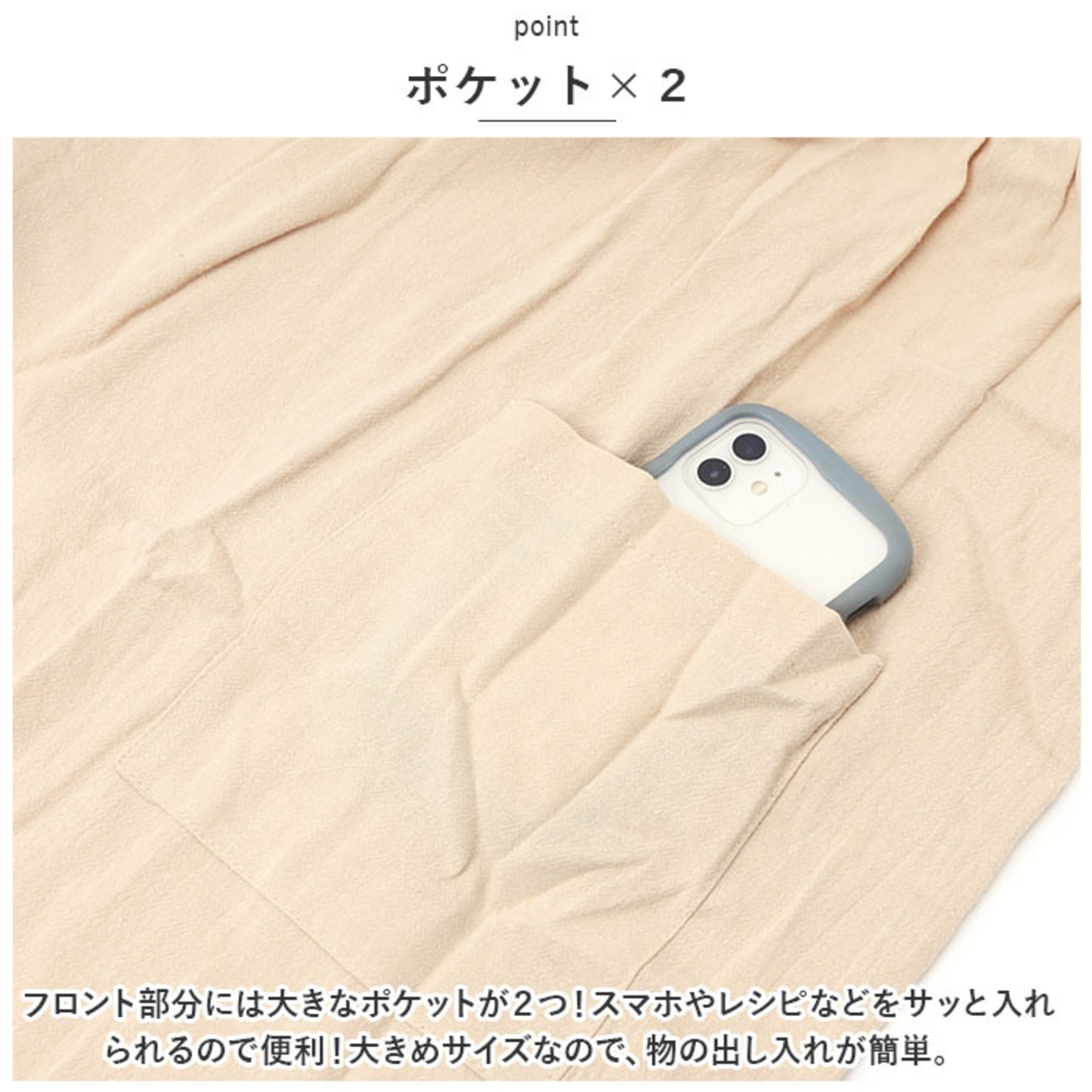 ・フロント部分には大きなポケットが2つ!スマホやレシピなどをサッと入れられるので便利!大きめサイズなので、物の出し入れが簡単。