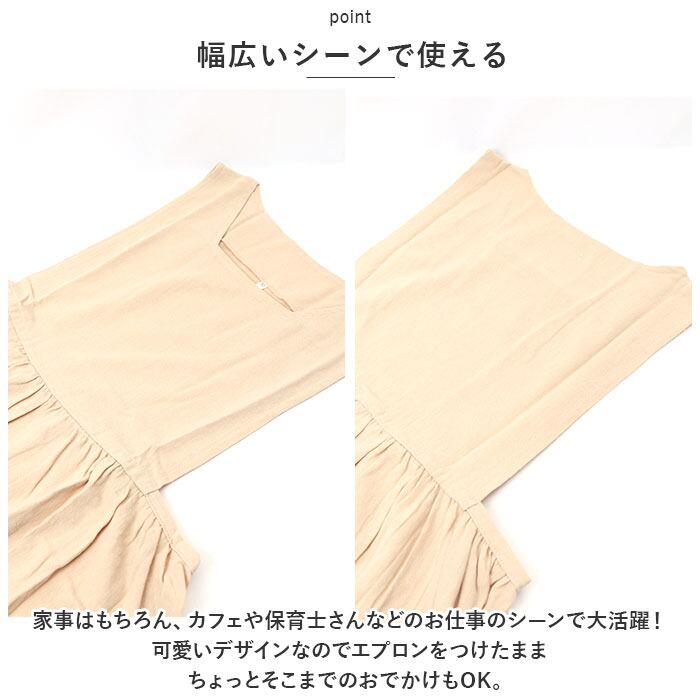 ・家事はもちろん、カフェや保育士さんなどのお仕事のシーンで大活躍!可愛いデザインなのでエプロンをつけたままちょっとそこまでのおでかけもOK。