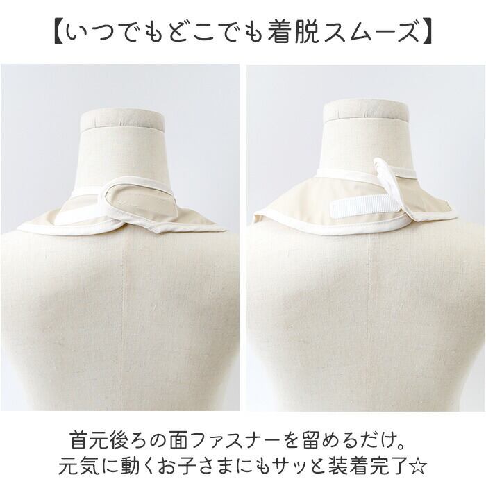 ・首元後ろの面ファスナーを留めるだけ。元気に動くお子さまにもサッと装着完了☆