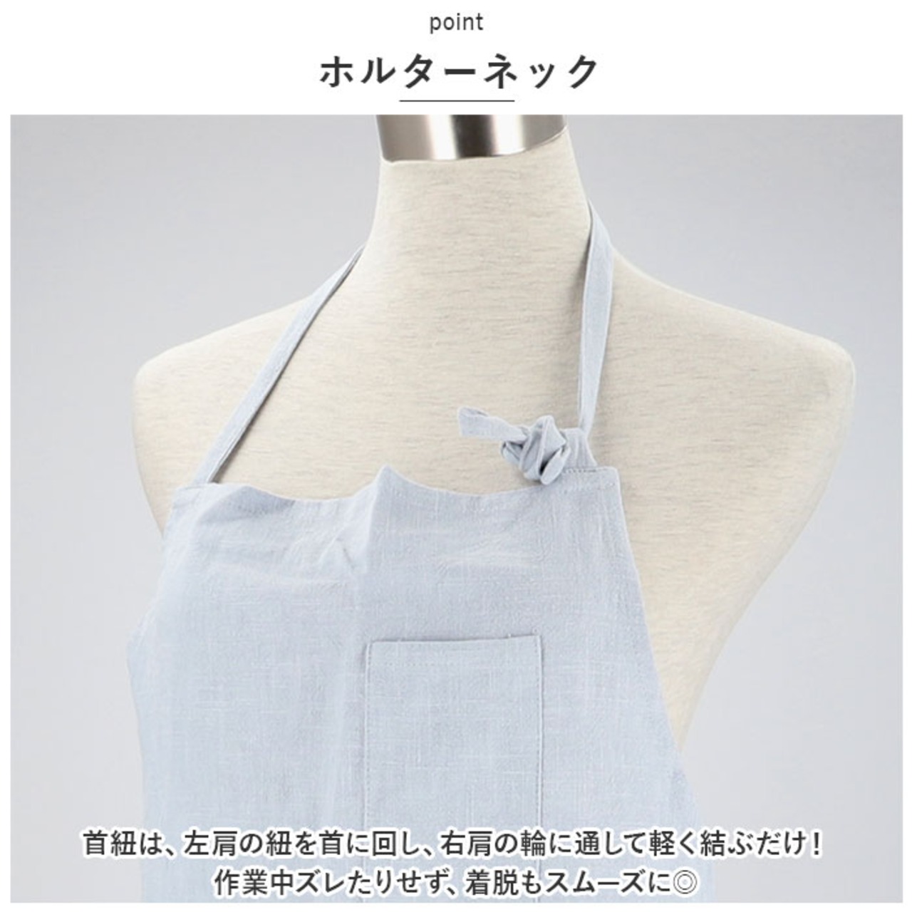 ・首紐は、左肩の紐を首に回し、右肩の輪に通して軽く結ぶだけ!作業中ズレたりせず、着脱もスムーズに◎
