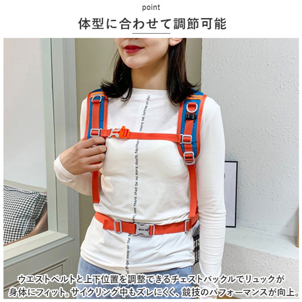 ・ウエストベルトと上下位置を調整できるチェストバックルでリュックが身体にフィット。サイクリング中もズレにくく、競技のパフォーマンスが向上。