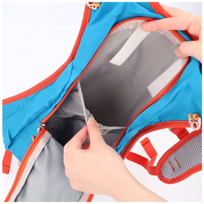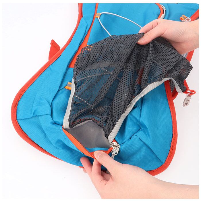 ・メインルーム内側のポケットはハイドレーションシステムに対応し、競技中でも両肩の給水ホース穴から水分補給が可能。(※ハイドレーションシステムとはリュックサック内の袋に飲料を入れ、左右の肩から口許までのびるチューブによって給水する仕組みのこと。)