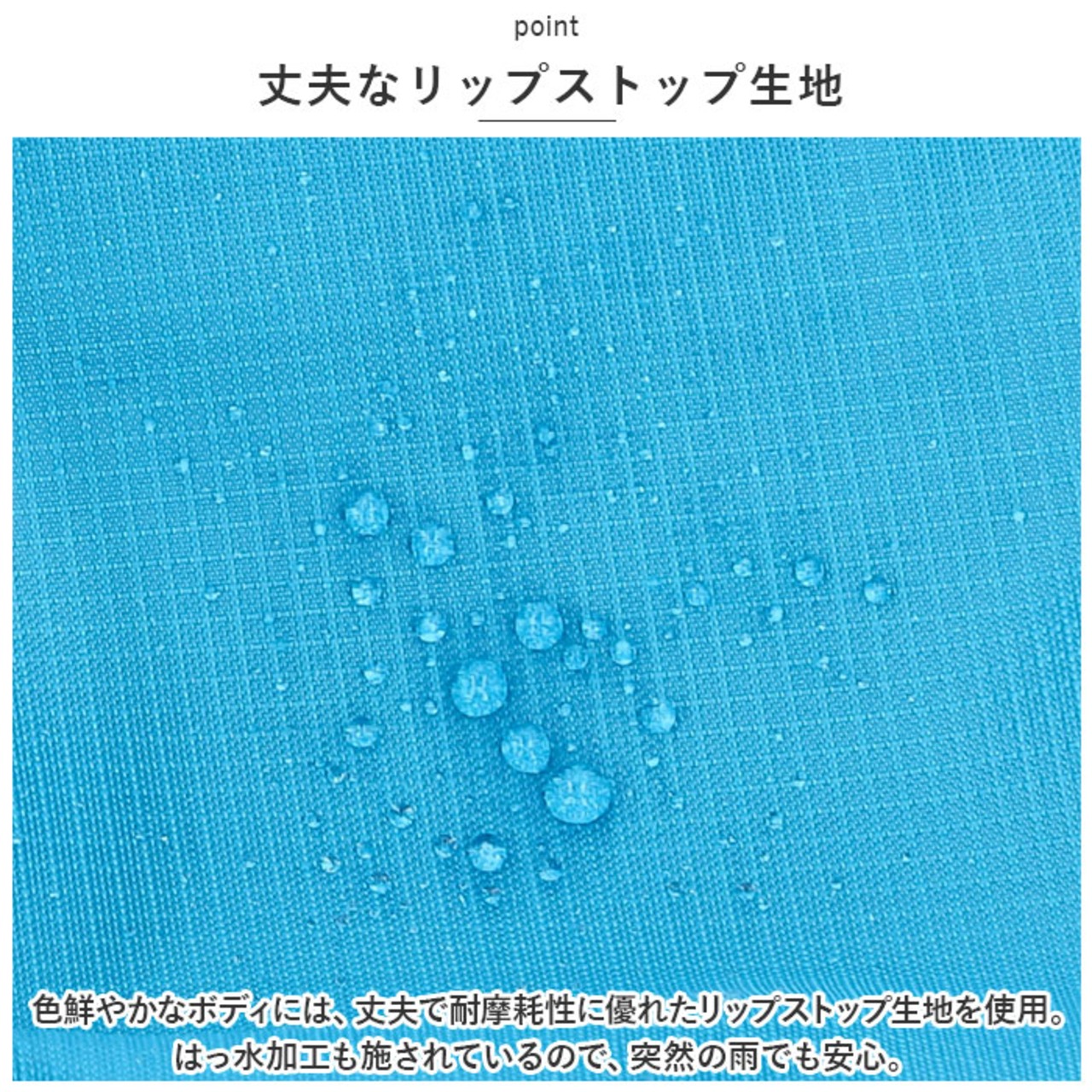 ・色鮮やかなボディには、丈夫で耐摩耗性に優れたリップストップ生地を使用。はっ水加工も施されているので、突然の雨でも安心。