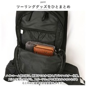 ・バッグの正面には小型のタブレットが収納できる斜めファスナーポケット、ウエストベルトにはスマホサイズのファスナーポケットを左右に配置。