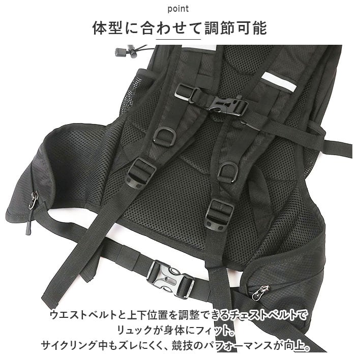 ・ウエストベルトと上下位置を調整できるチェストベルトでリュックが身体にフィット。サイクリング中もズレにくく、競技のパフォーマンスが向上。