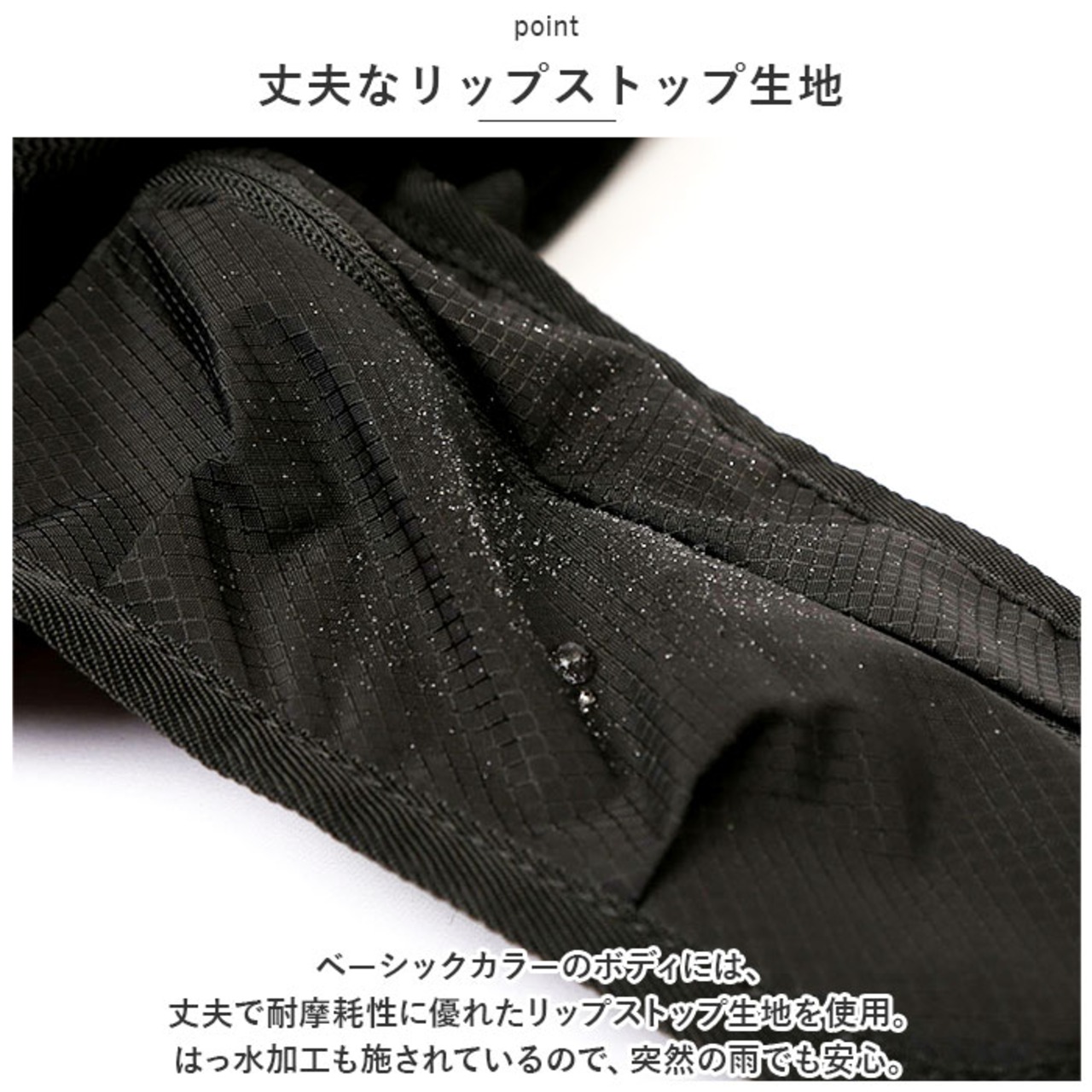 ・丈夫で耐摩耗性に優れたリップストップ生地を使用。はっ水加工も施されているので、突然の雨でも安心。