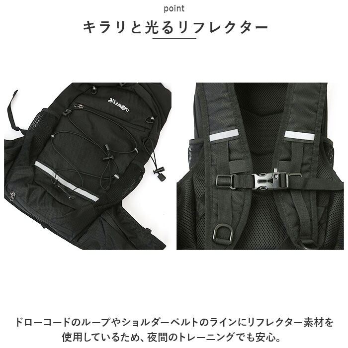 ・ドローコードのループやショルダーベルトのラインにリフレクター素材を使用しているため、夜間のトレーニングでも安心。