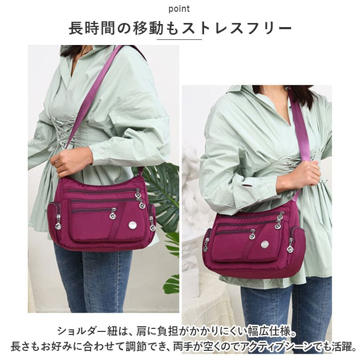 ・ショルダー紐は、肩に負担がかかりにくい幅広仕様。長さもお好みに合わせて調節でき、両手が空くのでアクティブシーンでも活躍。