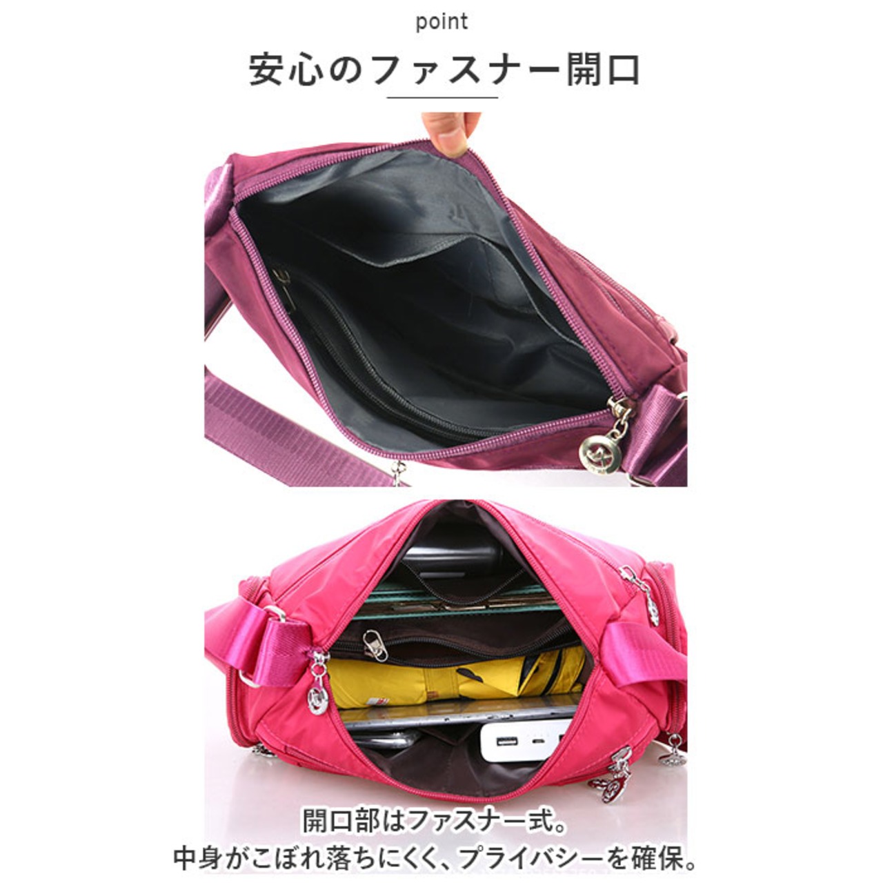 ・開口部はファスナー式。中身がこぼれ落ちにくく、プライバシーを確保。
