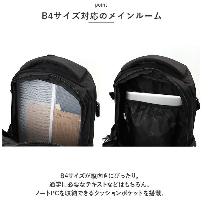 ・B4サイズが縦向きにぴったり。通学に必要なテキストなどはもちろん、ノートPCを収納できるクッションポケットを搭載。