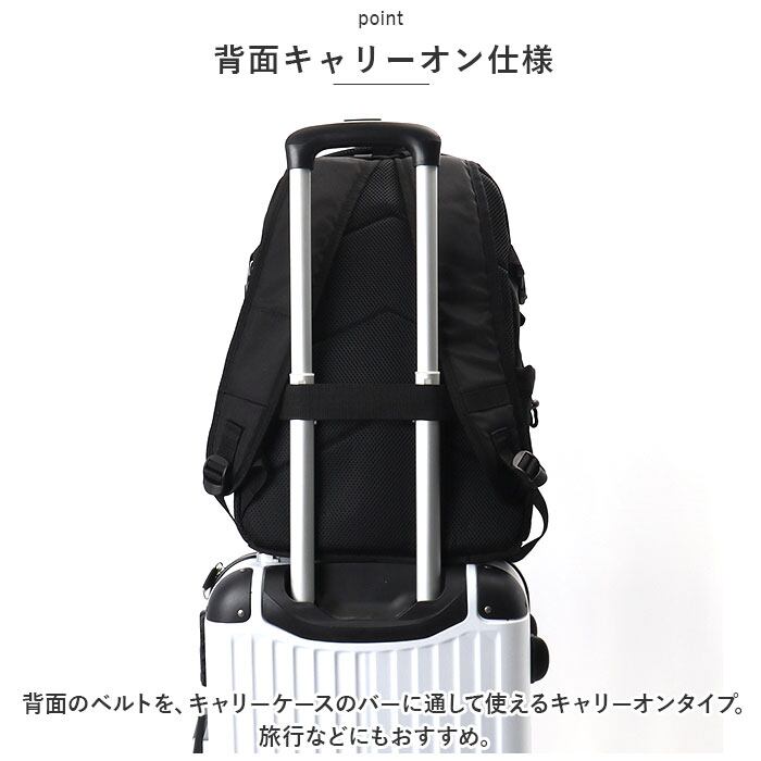 ・背面のベルトを、キャリーケースのバーに通して使えるキャリーオンタイプ。旅行などにもおすすめ。