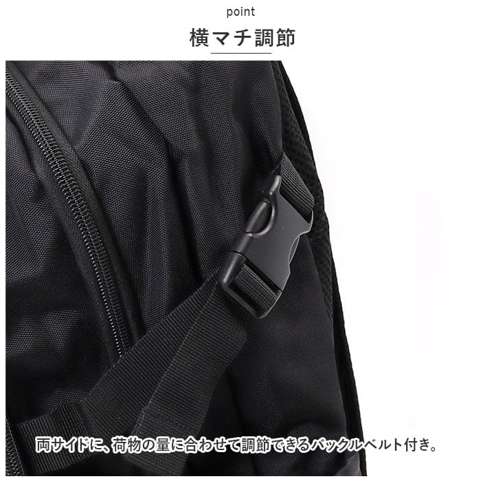 ・両サイドに、荷物の量に合わせて調節できるバックルベルト付き。