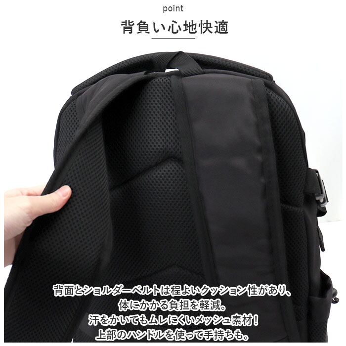 ・背面とショルダーベルトは程よいクッション性があり、体にかかる負担を軽減。汗をかいてもムレにくいメッシュ素材!上部のハンドルを使って手持ちも。