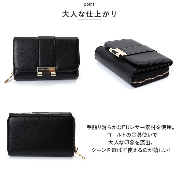 ・手触り滑らかなPUレザー素材を使用し、ゴールドの金具使いで大人な印象を演出。シーンを選ばず使えるのが嬉しい!
