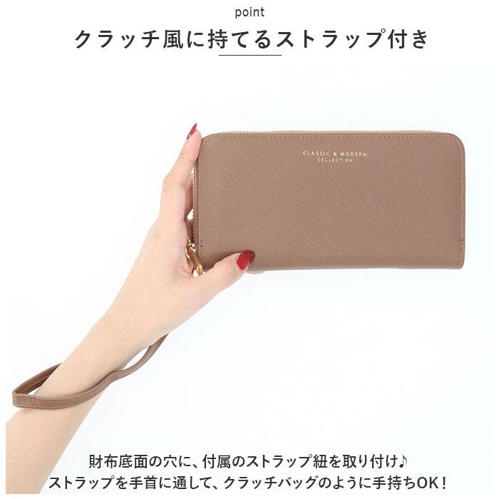 ・財布底面の穴に、付属のストラップ紐を取り付け♪ストラップを手首に通して、クラッチバッグのように手持ちOK!