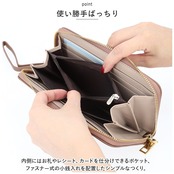 ・内側にはお札やレシート、カードを仕分けできるポケット、ファスナー式の小銭入れを配置したシンプルなつくり。