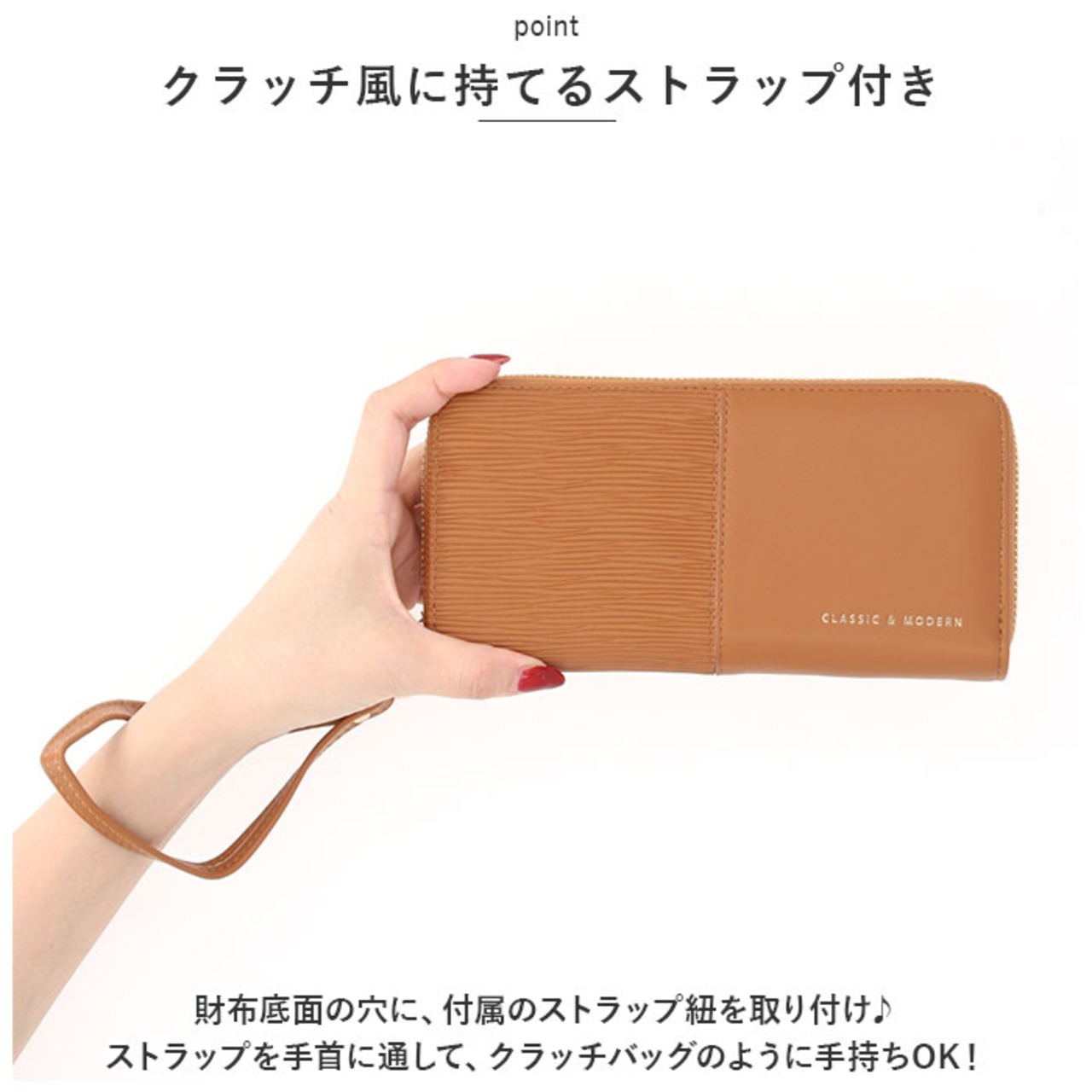 ・財布底面の穴に、付属のストラップ紐を取り付け♪ストラップを手首に通して、クラッチバッグのように手持ちOK!