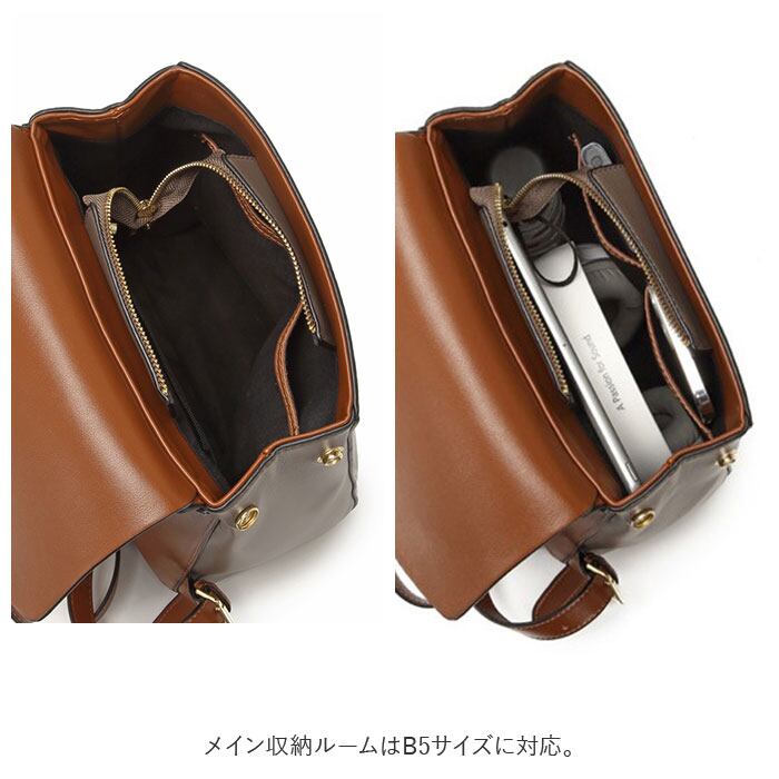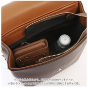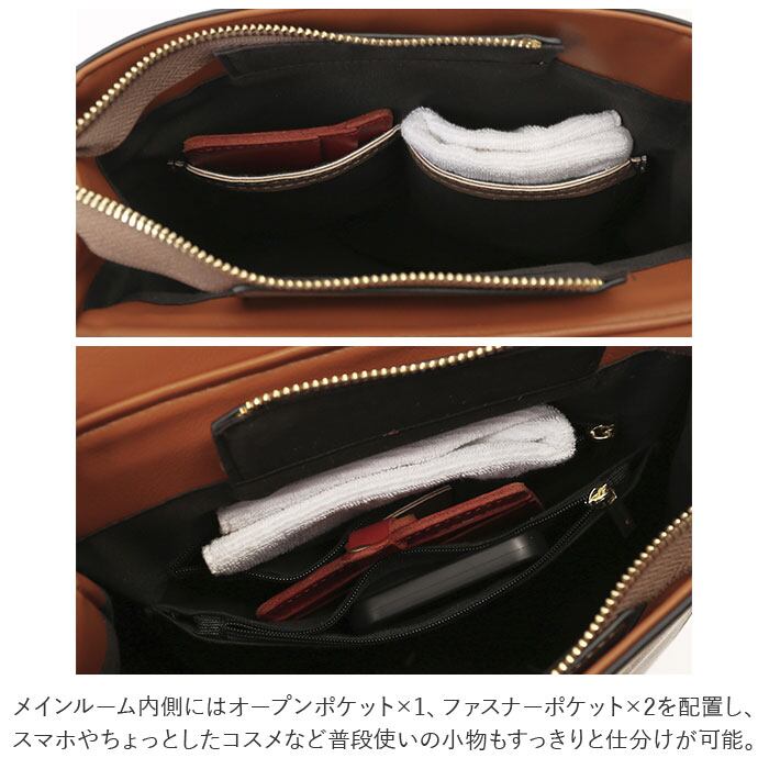 ・メインルーム内側にはオープンポケット×1、ファスナーポケット×2を配置し、スマホやちょっとしたコスメなど普段使いの小物もすっきりと仕分けが可能。